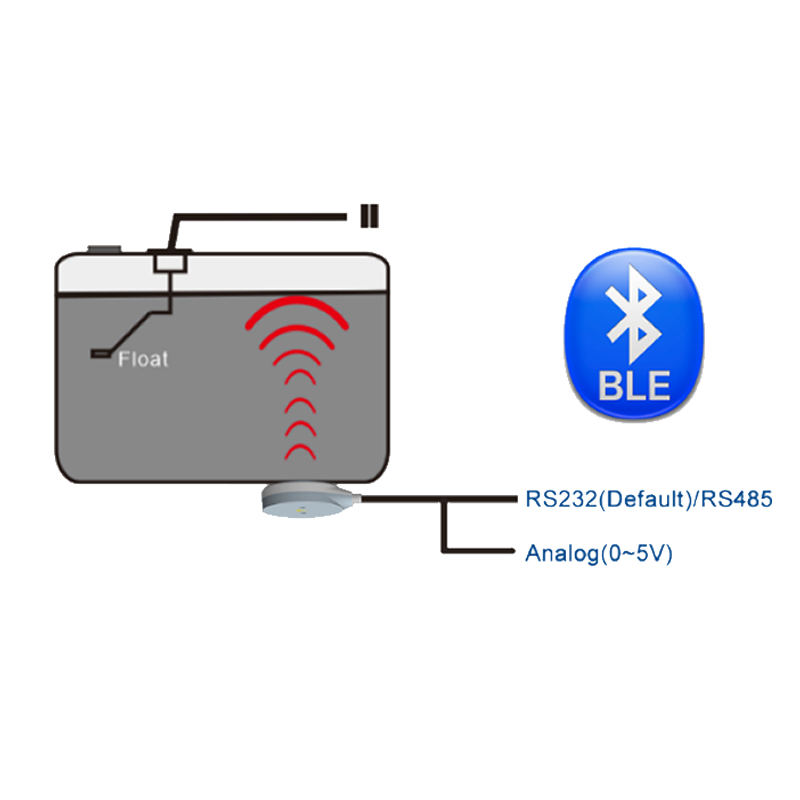 Non-contact easy installation on the bottom of fuel tank, which is compatible with all types of aluminum, plastic, stainless steel, metal tanks. 1~2.5meter range, with built-in temperature sensor and tilt sensor , widely used for truck, excavator, construction vehicles.